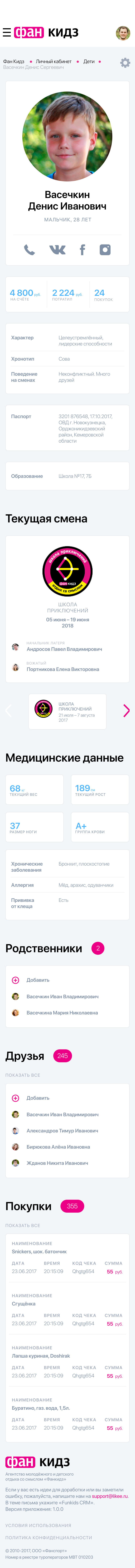 Для менеджеров агентства детского отдыха FUN.Кидз потребовалась удобная система для контроля и учёта отдыхающих детей. В системе были реализованы карточки с личными данными детей с указанием родственных и социальных связей, персональными данными, историей покупок в магазинах в лагерях отдыха.